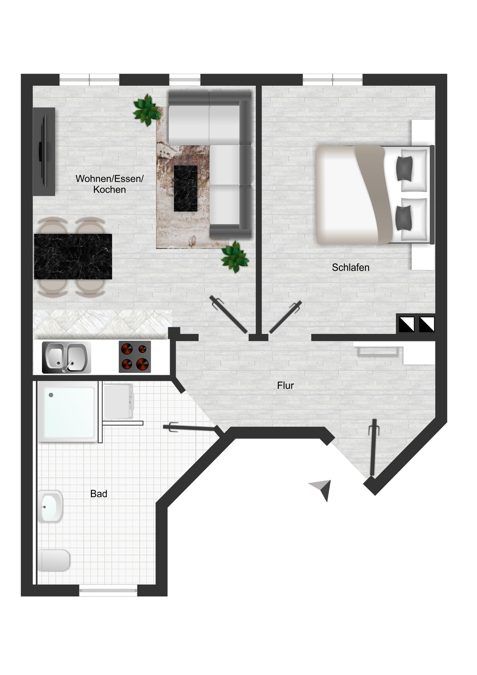 Die Raumaufteilung umfasst ein Wohnzimmer mit einer modernen Küche mit zeitgemäßer Ausstattung und ein ruhiges Schlafzimmer. Der Eingangsbereich bietet Platz für eine Garderobe und ermöglicht einen angenehmen Zugang zu den einzelnen Räumen.